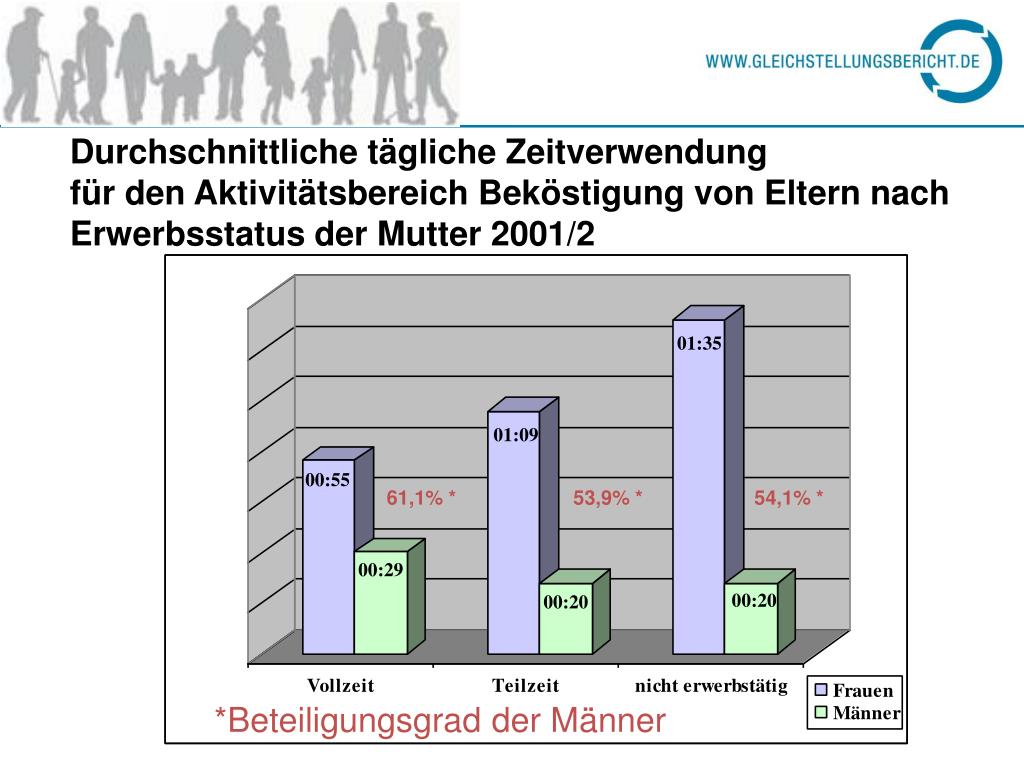 Durchschnittliche tägliche Zeitverwendung für den Aktivitätsbereich Beköstigung von Eltern nach Erwerbsstatus der Mutter 2001/2 61,1% * 53,9% * 54,1% * *Beteiligungsgrad der Männer