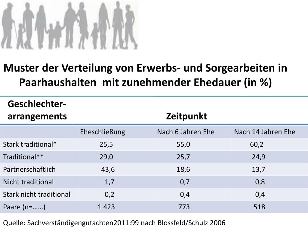 Muster der Verteilung von Erwerbs- und Sorgearbeiten in Paarhaushalten mit zunehmender Ehedauer (in %) Geschlechter- arrangements Zeitpunkt Quelle: Sachverständigengutachten2011:99 nach Blossfeld/Schulz 2006