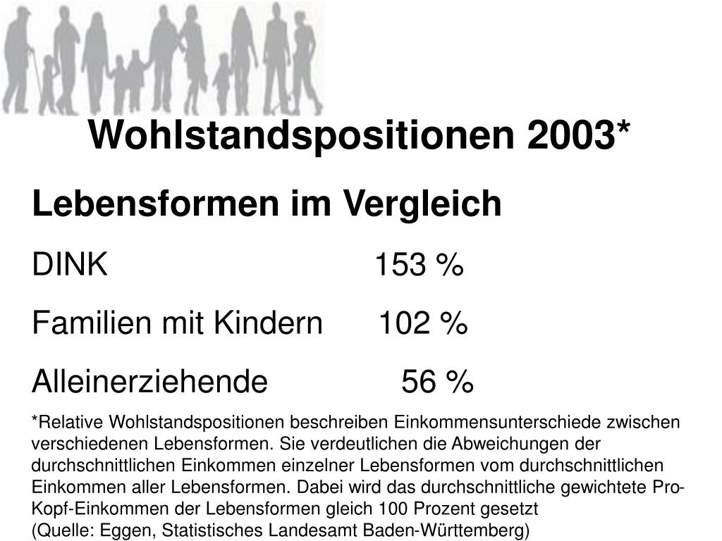 Wohlstandspositionen 2003* Lebensformen im Vergleich DINK 153 % Familien mit Kindern 102 % Alleinerziehende 56 % *Relative Wohlstandspositionen beschreiben Einkommensunterschiede zwischen verschiedenen Lebensformen. Sie verdeutlichen die Abweichungen der durchschnittlichen Einkommen einzelner Lebensformen vom durchschnittlichen Einkommen aller Lebensformen. Dabei wird das durchschnittliche gewichtete Pro-Kopf-Einkommen der Lebensformen gleich 100 Prozent gesetzt (Quelle: Eggen, Statistisches Landesamt Baden-Württemberg)