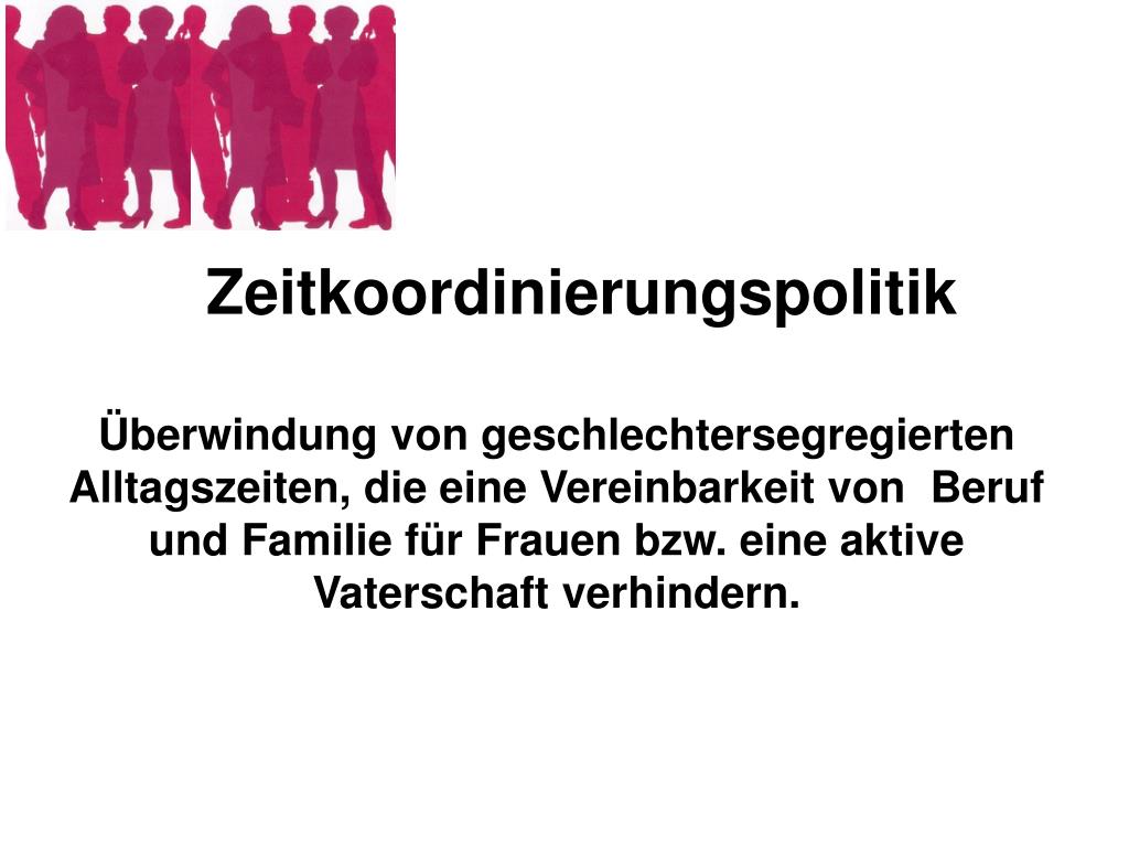 Zeitkoordinierungspolitik Überwindung von geschlechtersegregierten Alltagszeiten, die eine Vereinbarkeit von Beruf und Familie für Frauen bzw. eine aktive Vaterschaft verhindern.