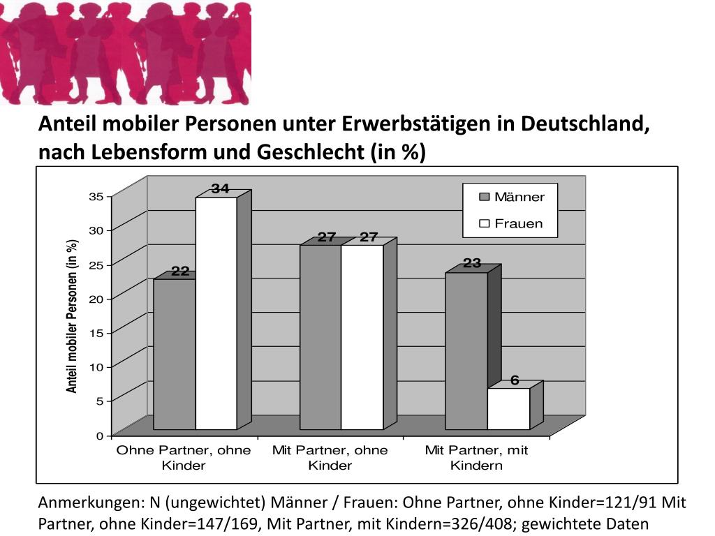 Anteil mobiler Personen unter Erwerbstätigen in Deutschland, nach Lebensform und Geschlecht (in %) Anmerkungen: N (ungewichtet) Männer / Frauen: Ohne Partner, ohne Kinder=121/91 Mit Partner, ohne Kinder=147/169, Mit Partner, mit Kindern=326/408; gewichtete Daten