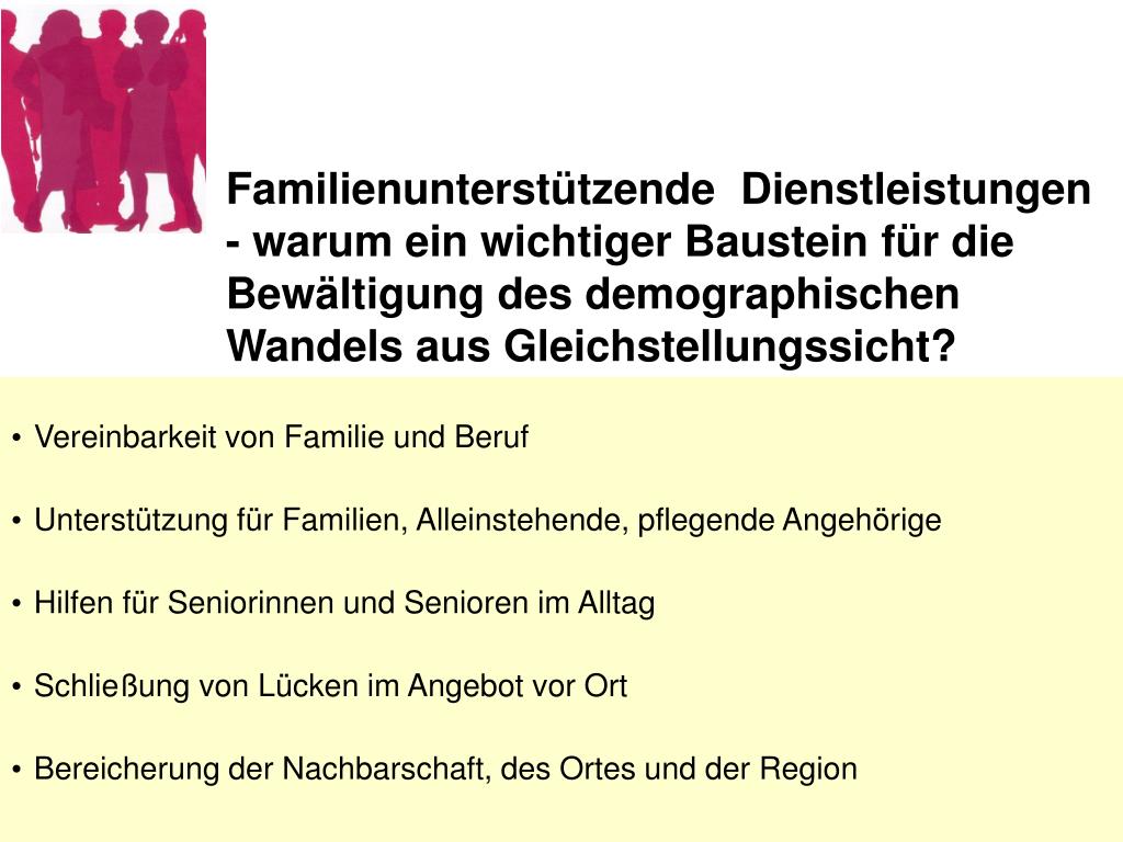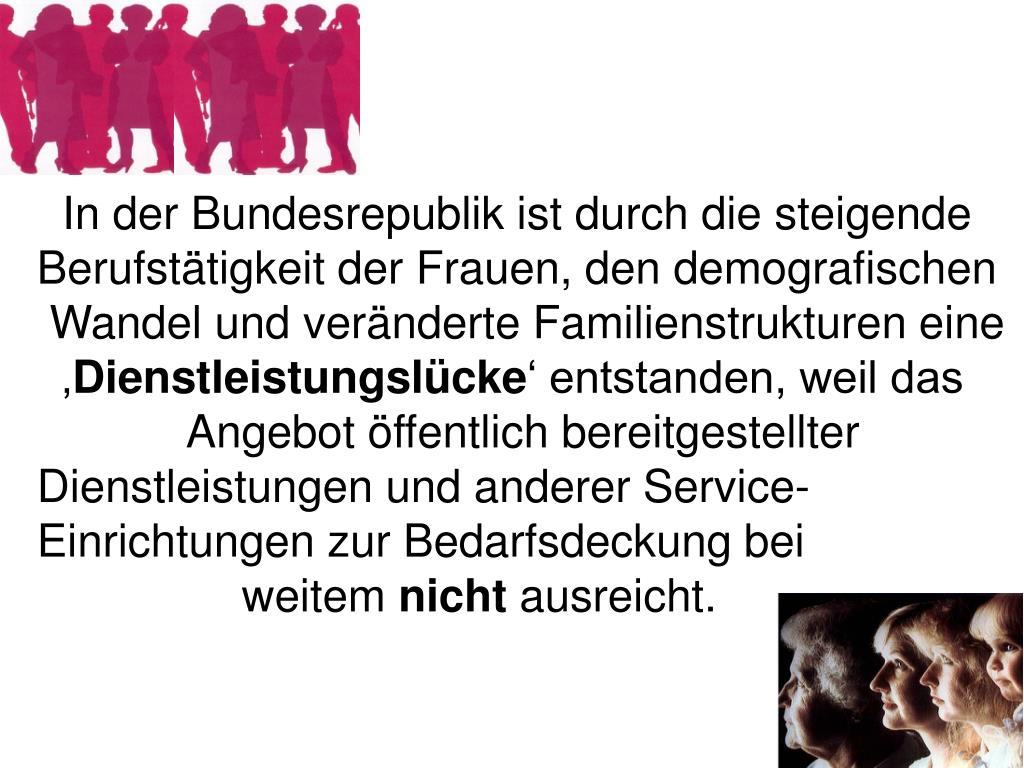 In der Bundesrepublik ist durch die steigende Berufstätigkeit der Frauen, den demografischen Wandel und veränderte Familienstrukturen eine ‚Dienstleistungslücke‘ entstanden, weil das Angebot öffentlich bereitgestellter Dienstleistungen und anderer Service- Einrichtungen zur Bedarfsdeckung bei weitem nicht ausreicht.