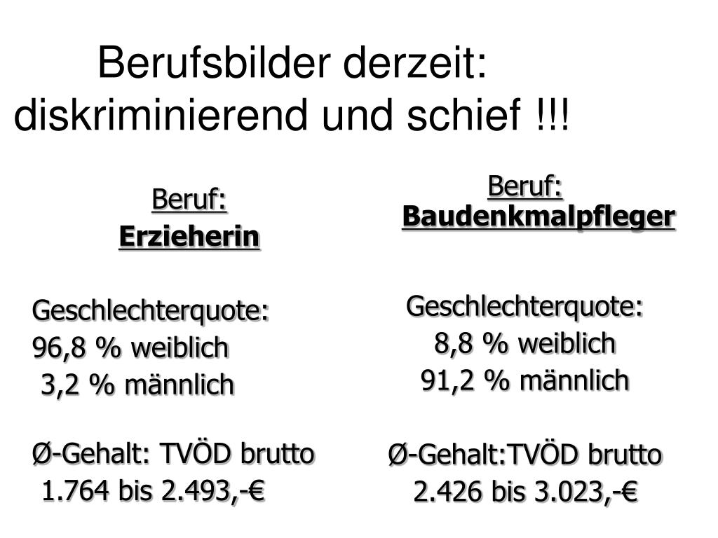 Berufsbilder derzeit: diskriminierend und schief !!! Beruf: Erzieherin Geschlechterquote: 96,8 % weiblich 3,2 % männlich Ø-Gehalt: TVÖD brutto 1.764 bis 2.493,-€ Beruf: Baudenkmalpfleger Geschlechterquote: 8,8 % weiblich 91,2 % männlich Ø-Gehalt:TVÖD brutto 2.426 bis 3.023,-€