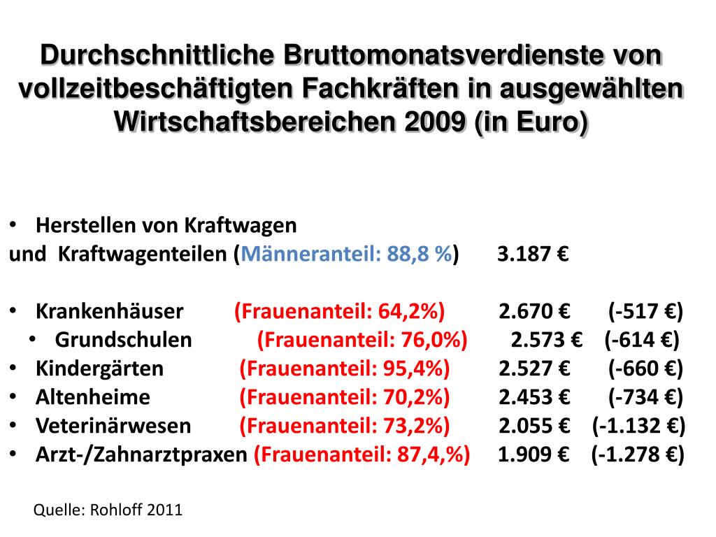 Durchschnittliche Bruttomonatsverdienste von vollzeitbeschäftigten Fachkräften in ausgewählten Wirtschaftsbereichen 2009 (in Euro) • Herstellen von Kraftwagen und Kraftwagenteilen (Männeranteil: 88,8 %) 3.187 € • Krankenhäuser (Frauenanteil: 64,2%) 2.670 € (-517 €) • Grundschulen (Frauenanteil: 76,0%) 2.573 € (-614 €) • Kindergärten (Frauenanteil: 95,4%) 2.527 € (-660 €) • Altenheime (Frauenanteil: 70,2%) 2.453 € (-734 €) • Veterinärwesen (Frauenanteil: 73,2%) 2.055 € (-1.132 €) • Arzt-/Zahnarztpraxen (Frauenanteil: 87,4,%) 1.909 € (-1.278 €) Quelle: Rohloff 2011