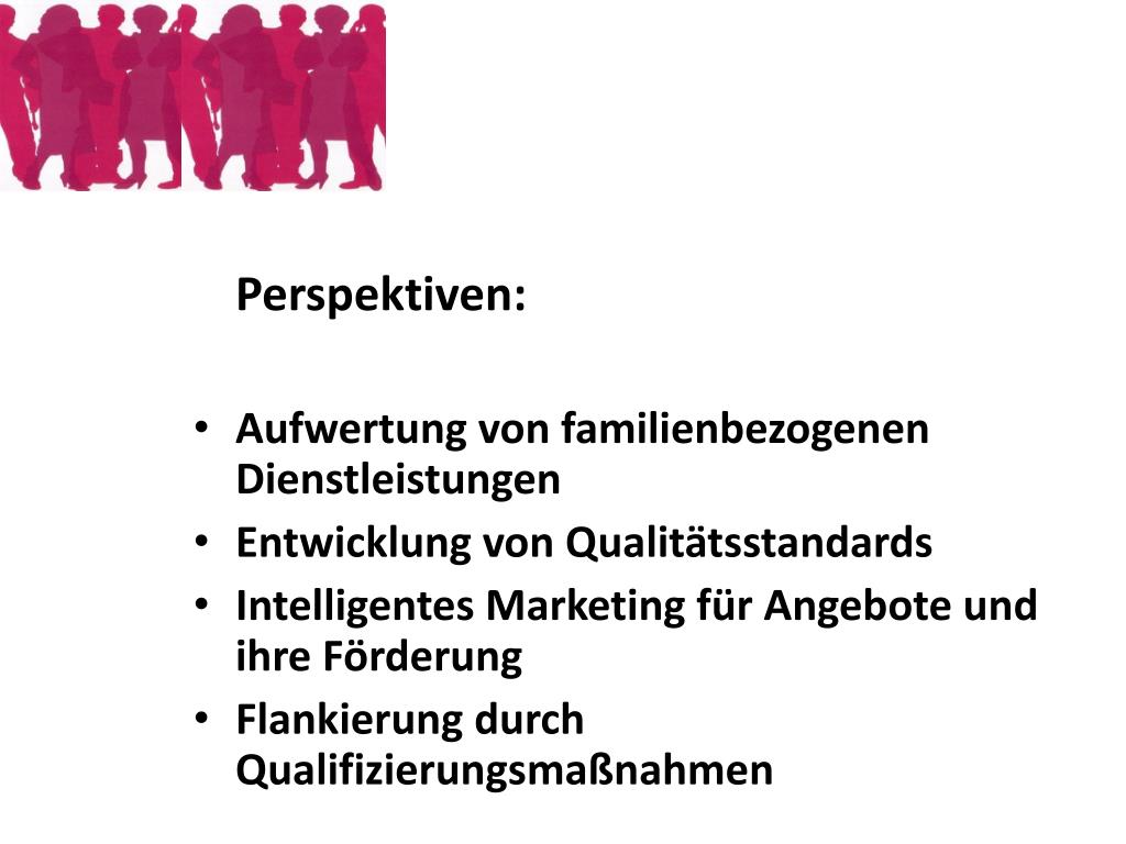 Perspektiven: • Aufwertung von familienbezogenen Dienstleistungen • Entwicklung von Qualitätsstandards • Intelligentes Marketing für Angebote und ihre Förderung • Flankierung durch Qualifizierungsmaßnahmen