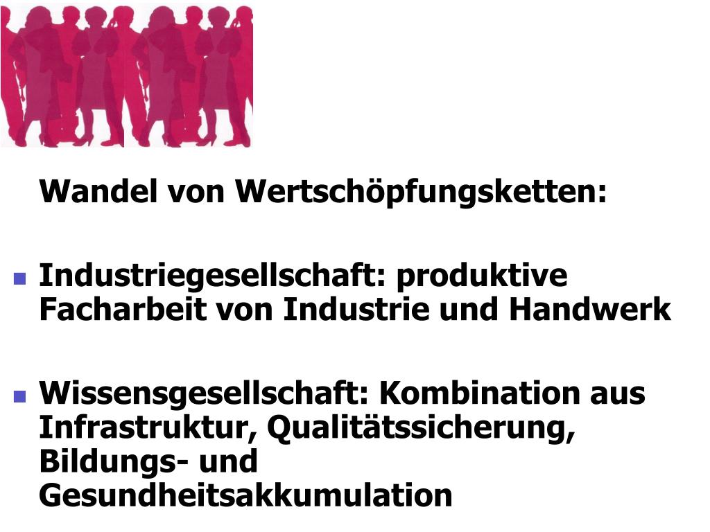 Wandel von Wertschöpfungsketten: • Industriegesellschaft: produktive Facharbeit von Industrie und Handwerk • Wissensgesellschaft: Kombination aus Infrastruktur, Qualitätssicherung, Bildungs- und Gesundheitsakkumulation