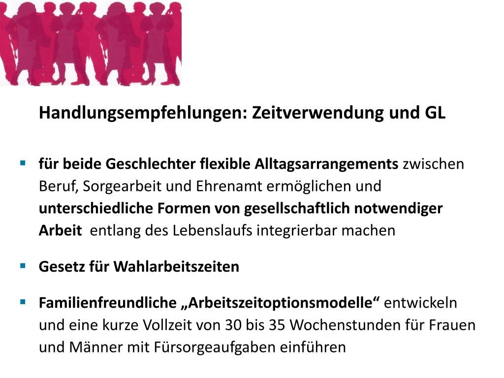 Handlungsempfehlungen: Zeitverwendung und GL • für beide Geschlechter flexible Alltagsarrangements zwischen Beruf, Sorgearbeit und Ehrenamt ermöglichen und unterschiedliche Formen von gesellschaftlich notwendiger Arbeit entlang des Lebenslaufs integrierbar machen • Gesetz für Wahlarbeitszeiten • Familienfreundliche „Arbeitszeitoptionsmodelle“ entwickeln und eine kurze Vollzeit von 30 bis 35 Wochenstunden für Frauen und Männer mit Fürsorgeaufgaben einführen