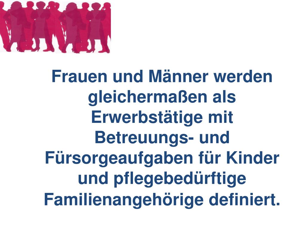 Frauen und Männer werden gleichermaßen als Erwerbstätige mit Betreuungs- und Fürsorgeaufgaben für Kinder und pflegebedürftige Familienangehörige definiert.