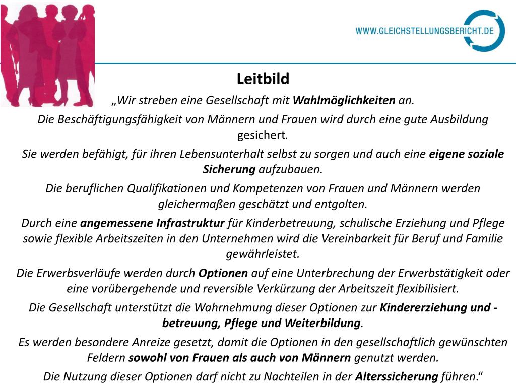 Leitbild „Wir streben eine Gesellschaft mit Wahlmöglichkeiten an. Die Beschäftigungsfähigkeit von Männern und Frauen wird durch eine gute Ausbildung gesichert. Sie werden befähigt, für ihren Lebensunterhalt selbst zu sorgen und auch eine eigene soziale Sicherung aufzubauen. Die beruflichen Qualifikationen und Kompetenzen von Frauen und Männern werden gleichermaßen geschätzt und entgolten. Durch eine angemessene Infrastruktur für Kinderbetreuung, schulische Erziehung und Pflege sowie flexible Arbeitszeiten in den Unternehmen wird die Vereinbarkeit für Beruf und Familie gewährleistet. Die Erwerbsverläufe werden durch Optionen auf eine Unterbrechung der Erwerbstätigkeit oder eine vorübergehende und reversible Verkürzung der Arbeitszeit flexibilisiert. Die Gesellschaft unterstützt die Wahrnehmung dieser Optionen zur Kindererziehung und -betreuung, Pflege und Weiterbildung. Es werden besondere Anreize gesetzt, damit die Optionen in den gesellschaftlich gewünschten Feldern sowohl von Frauen als auch von Männern genutzt werden. Die Nutzung dieser Optionen darf nicht zu Nachteilen in der Alterssicherung führen.“