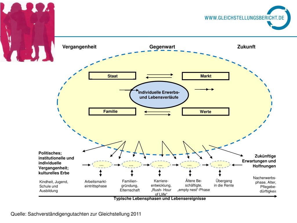 Vergangenheit Gegenwart Zukunft Staat Markt Individuelle Erwerbs- und Lebensverläufe Familie Werte Politisches; institutionelle und individuelle Vergangenheit; kulturelles Erbe Zukünftige Erwartungen und Hoffnungen ··· ··· ··· ··· ··· Nacherwerbs-phase, Alter,Pflegebe-dürftigkeit Ältere Be-schäftigte, „empty nest“-Phase Übergangin die Rente Karriere-entwicklung, „Rush- Hour of Llife“ Familien-gründung, Elternschaft Arbeitsmarkt-eintrittsphase Kindheit, Jugend, Schule und Ausbildung Typische Lebensphasen und Lebensereignisse Quelle: Sachverständigengutachten zur Gleichstellung 2011