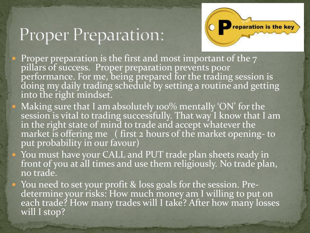 Proper Preparation: • Proper preparation is the first and most important of the 7 pillars of success. Proper preparation prevents poor performance. For me, being prepared for the trading session is doing my daily trading schedule by setting a routine and getting into the right mindset. • Making sure that I am absolutely 100% mentally ‘ON’ for the session is vital to trading successfully. That way I know that I am in the right state of mind to trade and accept whatever the market is offering me ( first 2 hours of the market opening- to put probability in our favour) • You must have your CALL and PUT trade plan sheets ready in front of you at all times and use them religiously. No trade plan, no trade. • You need to set your profit & loss goals for the session. Pre-determine your risks: How much money am I willing to put on each trade? How many trades will I take? After how many losses will I stop?
