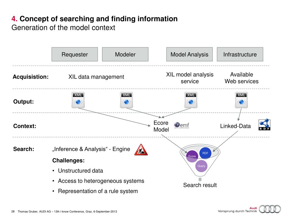 4. Concept of searching and finding informationGeneration of the model context Requester Modeler Model Analysis Infrastructure XIL model analysis service Available Web services Acquisistion: XIL data management Output: Ecore Model Context: Linked-Data Search: „Inference & Analysis“ - Engine • Challenges: • Unstructured data • Access to heterogeneous systems • Representation of a rule system Thomas Gruber, AUDI AG – 13th i-know Conference, Graz, 6-September-2013