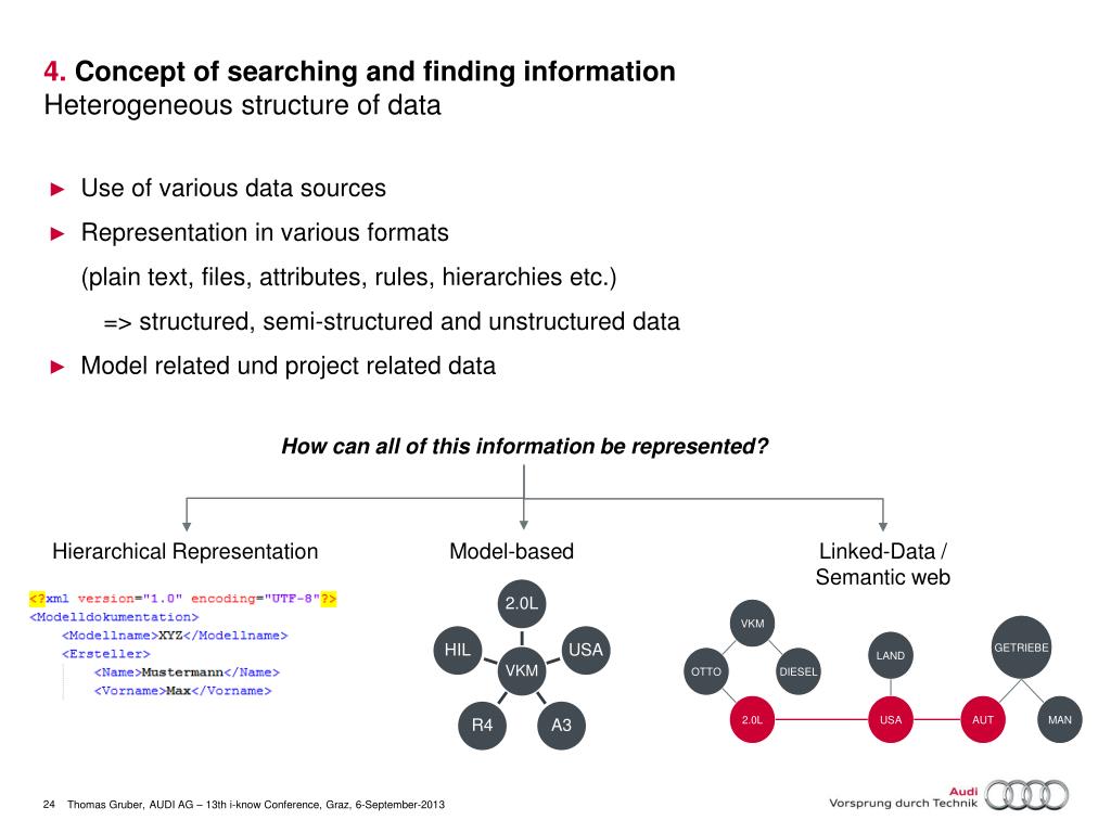 4. Concept of searching and finding informationHeterogeneous structure of data • Use of various data sources • Representation in various formats(plain text, files, attributes, rules, hierarchies etc.) => structured, semi-structured and unstructured data • Model related und project related data How can all of this information be represented? Hierarchical Representation Model-based Linked-Data / Semantic web VKM GETRIEBE LAND OTTO DIESEL 2.0L USA AUT MAN Thomas Gruber, AUDI AG – 13th i-know Conference, Graz, 6-September-2013