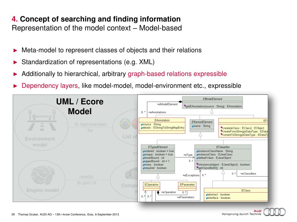 4. Concept of searching and finding informationRepresentation of the model context – Model-based • Meta-model to represent classes of objects and their relations • Standardization of representations (e.g. XML) • Additionally to hierarchical, arbitrary graph-based relations expressible • Dependency layers, like model-model, model-environment etc., expressible UML / Ecore Model Is represented by List of Countries Environment model valid needs/ Is part of not valid Complete vehicle model List of Countries Engine model Thomas Gruber, AUDI AG – 13th i-know Conference, Graz, 6-September-2013