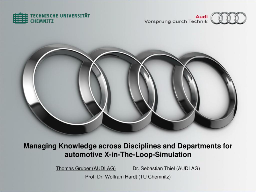 Managing Knowledge across Disciplines and Departments for automotive X-in-The-Loop-Simulation . Thomas Gruber (AUDI AG) Dr. Sebastian Thiel (AUDI AG) Prof. Dr. Wolfram Hardt (TU Chemnitz). Agenda. Motivation Success factors of a XiL model exchange platform „Documentation“ is the key