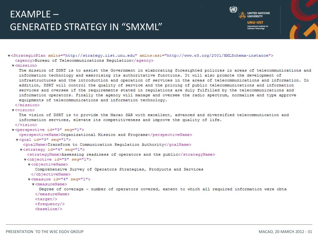Component 5 – markup languages Provides XML Language for ITSM (smXML): Underlying object model is based on the Strategy Management Model (C1) Developed to enable integration of strategies across government Provides representations for strategic plans and scorecards Covers the main elements of StratML Elements include: Organization, Mission, Vision, Perspective, Goal, Strategy, Objective, Initiative, Project, Measures Also supports StratML as alternative format