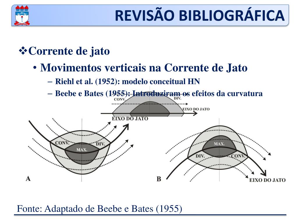 REVISÃO BIBLIOGRÁFICA • Corrente de jato • Movimentos verticais na Corrente de Jato • Riehlet al. (1952): modelo conceitual HN • Beebe e Bates (1955): Introduziram os efeitos da curvatura Fonte: Adaptado de Beebe e Bates (1955)