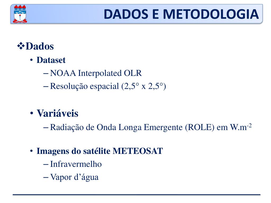 DADOS E METODOLOGIA • Dados • Dataset • NOAA Interpolated OLR • Resolução espacial (2,5° x 2,5°) • Variáveis • Radiação de Onda Longa Emergente (ROLE) em W.m-2 • Imagens do satélite METEOSAT • Infravermelho • Vapor d’água