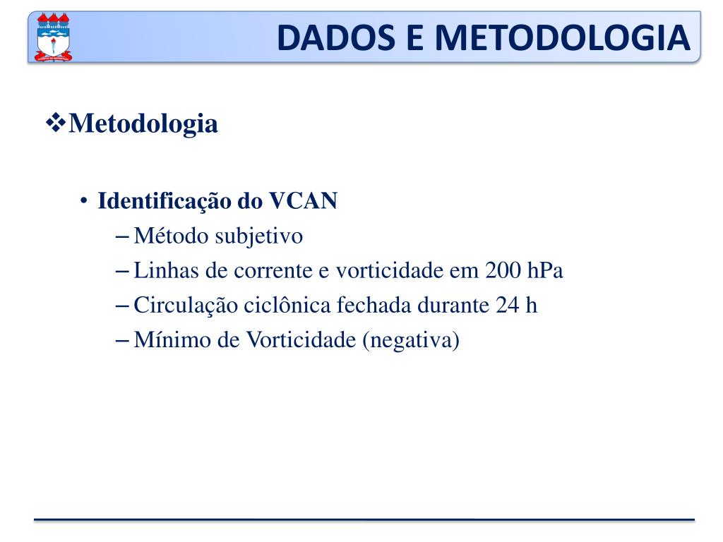 DADOS E METODOLOGIA • Metodologia • Identificação do VCAN • Método subjetivo • Linhas de corrente e vorticidade em 200 hPa • Circulação ciclônica fechada durante 24 h • Mínimo de Vorticidade (negativa)