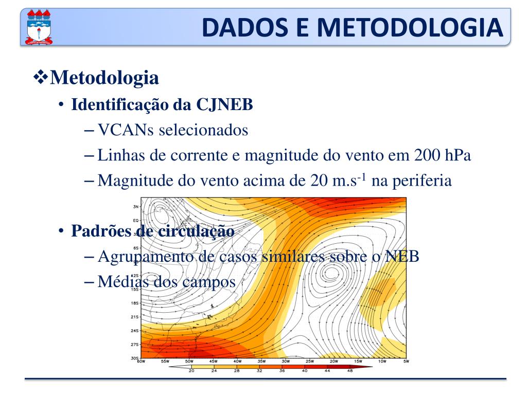 DADOS E METODOLOGIA • Metodologia • Identificação da CJNEB • VCANs selecionados • Linhas de corrente e magnitude do vento em 200 hPa • Magnitude do vento acima de 20 m.s-1 na periferia • Padrões de circulação • Agrupamento de casos similares sobre o NEB • Médias dos campos