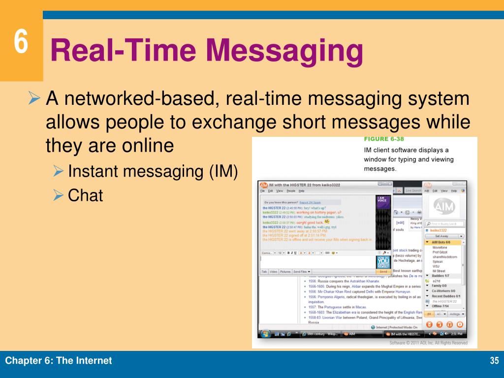 Real-Time Messaging • A networked-based, real-time messaging system allows people to exchange short messages while they are online • Instant messaging (IM) • Chat Chapter 6: The Internet