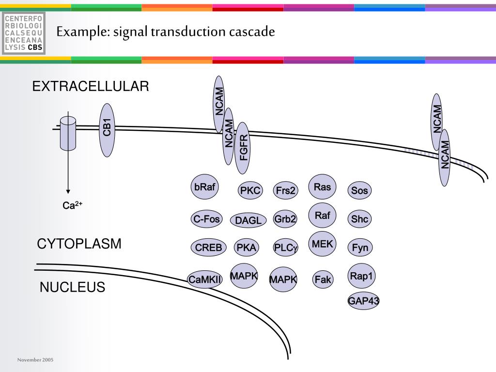 Example: signal transduction cascade EXTRACELLULAR NCAM NCAM CB1 NCAM FGFR NCAM bRaf Ras PKC Frs2 Sos Ca2+ Raf C-Fos Grb2 Shc DAGL MEK CYTOPLASM CREB PKA PLC Fyn MAPK Rap1 MAPK CaMKII Fak NUCLEUS GAP43