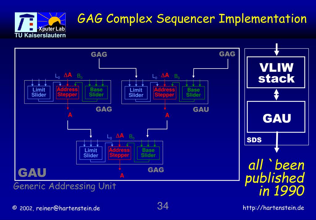 GAG GAG DA DA DA L0 L0 L0 B0 B0 B0 VLIW stack GAU Address Stepper Address Stepper Address Stepper Base Slider Base Slider Base Slider Limit Slider Limit Slider Limit Slider GAU GAG GAG A A A SDS GAU GAG Complex Sequencer Implementation all `been published in 1990 Generic Addressing Unit 34