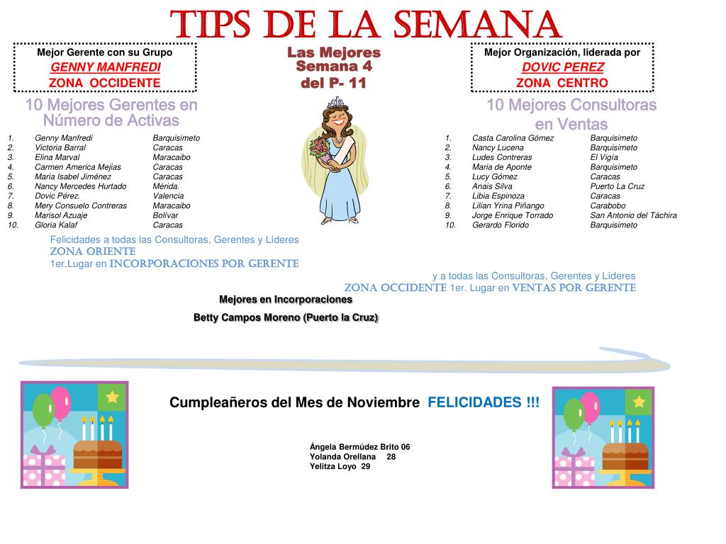 TIPS DE LA SEMANA Mejor Gerente con su Grupo GENNY MANFREDI ZONA OCCIDENTE Las Mejores Semana 4 del P- 11 Mejor Organización, liderada por DOVIC PEREZ ZONA CENTRO 10 Mejores Gerentes en Número de Activas 10 Mejores Consultoras en Ventas • Genny Manfredi Barquisimeto • Victoria Barral Caracas • Elina Marval Maracaibo • Carmen America Mejias Caracas • Maria Isabel Jiménez Caracas • Nancy Mercedes Hurtado Mérida. • Dovic Pérez. Valencia • Mery Consuelo Contreras Maracaibo • Marisol Azuaje Bolívar • Gloria Kalaf Caracas • Casta Carolina Gómez Barquisimeto • Nancy Lucena Barquisimeto • Ludes Contreras El Vigía • Maria de Aponte Barquisimeto • Lucy Gómez Caracas • Anais Silva Puerto La Cruz • Libia Espinoza Caracas • Lilian Yrina Piñango Carabobo • Jorge Enrique Torrado San Antonio del Táchira • Gerardo Florido Barquisimeto Felicidades a todas las Consultoras, Gerentes y Líderes ZONA ORIENTE 1er.Lugar en INCORPORACIONES POR GERENTE y a todas las Consultoras, Gerentes y Líderes ZONA OCCIDENTE 1er. Lugar en VENTAS POR GERENTE Mejores en Incorporaciones Betty Campos Moreno (Puerto la Cruz) Cumpleañeros del Mes de Noviembre FELICIDADES !!! Ángela Bermúdez Brito 06 Yolanda Orellana 28 Yelitza Loyo 29