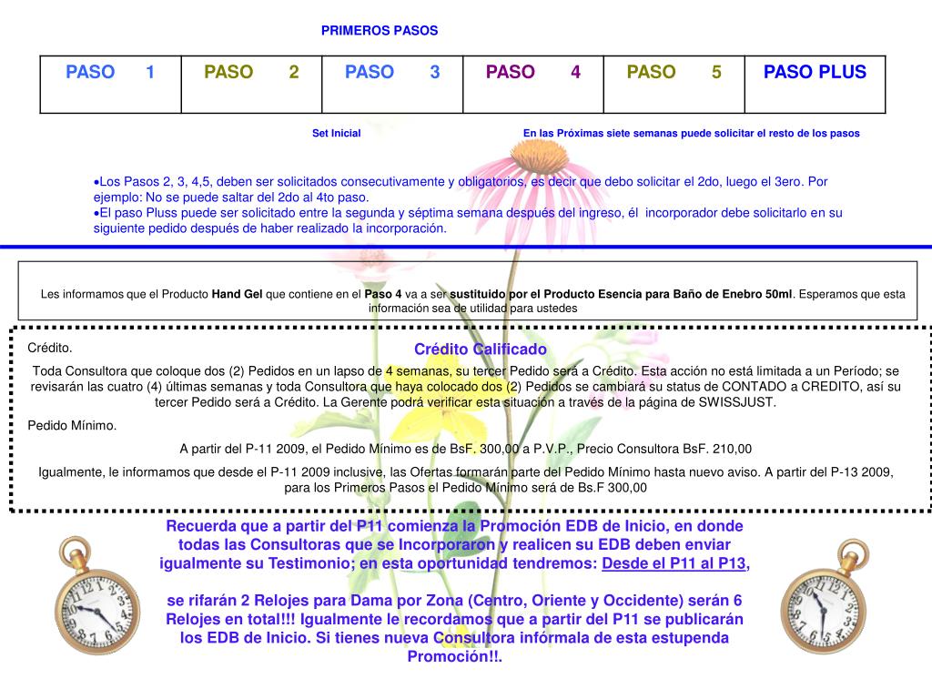PRIMEROS PASOS • Los Pasos 2, 3, 4,5, deben ser solicitados consecutivamente y obligatorios, es decir que debo solicitar el 2do, luego el 3ero. Por ejemplo: No se puede saltar del 2do al 4to paso. • El paso Pluss puede ser solicitado entre la segunda y séptima semana después del ingreso, él incorporador debe solicitarlo en su siguiente pedido después de haber realizado la incorporación. Set Inicial En las Próximas siete semanas puede solicitar el resto de los pasos Les informamos que el Producto Hand Gel que contiene en el Paso 4 va a ser sustituido por el Producto Esencia para Baño de Enebro 50ml. Esperamos que esta información sea de utilidad para ustedes Crédito. Toda Consultora que coloque dos (2) Pedidos en un lapso de 4 semanas, su tercer Pedido será a Crédito. Esta acción no está limitada a un Período; se revisarán las cuatro (4) últimas semanas y toda Consultora que haya colocado dos (2) Pedidos se cambiará su status de CONTADO a CREDITO, así su tercer Pedido será a Crédito. La Gerente podrá verificar esta situación a través de la página de SWISSJUST. Pedido Mínimo. A partir del P-11 2009, el Pedido Mínimo es de BsF. 300,00 a P.V.P., Precio Consultora BsF. 210,00 Igualmente, le informamos que desde el P-11 2009 inclusive, las Ofertas formarán parte del Pedido Mínimo hasta nuevo aviso. A partir del P-13 2009, para los Primeros Pasos el Pedido Mínimo será de Bs.F 300,00 Crédito Calificado Recuerda que a partir del P11 comienza la Promoción EDB de Inicio, en donde todas las Consultoras que se Incorporaron y realicen su EDB deben enviar igualmente su Testimonio; en esta oportunidad tendremos: Desde el P11 al P13, se rifarán 2 Relojes para Dama por Zona (Centro, Oriente y Occidente) serán 6 Relojes en total!!! Igualmente le recordamos que a partir del P11 se publicarán los EDB de Inicio. Si tienes nueva Consultora infórmala de esta estupenda Promoción!!.