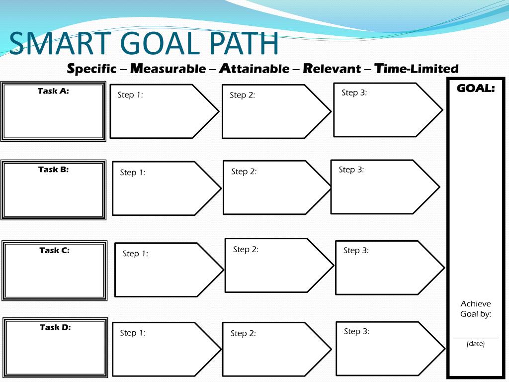 Step 3: Step 3: Step 3: Step 3: Step 1: Step 2: Step 1: Step 1: Step 2: Step 2: Step 1: Step 2: SMART GOAL PATH Specific –Measurable –Attainable –Relevant –Time-Limited GOAL: Achieve Goal by: (date) Task A: Task B: Task C: Task D: