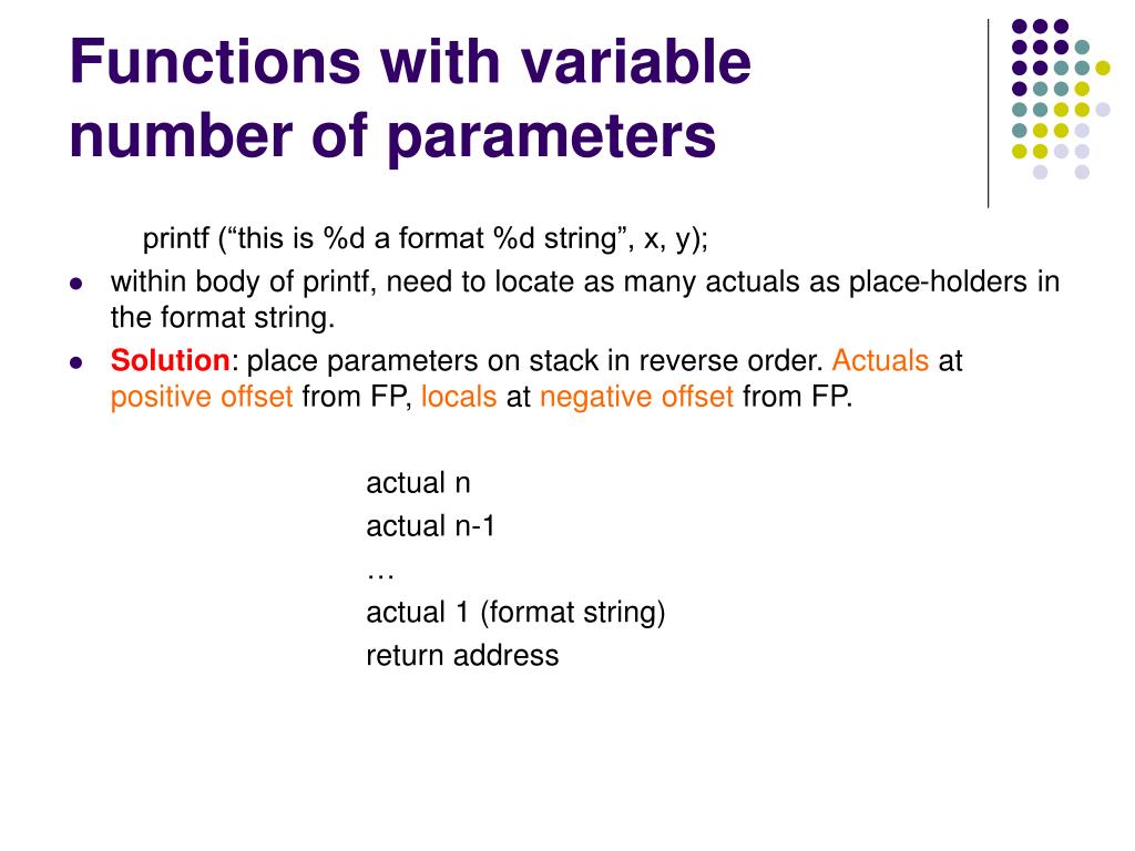 Functions with variable number of parameters printf (“this is %d a format %d string”, x, y); • within body of printf, need to locate as many actuals as place-holders in the format string. • Solution: place parameters on stack in reverse order. Actuals at positive offset from FP, locals at negative offset from FP. actual n actual n-1 … actual 1 (format string) return address