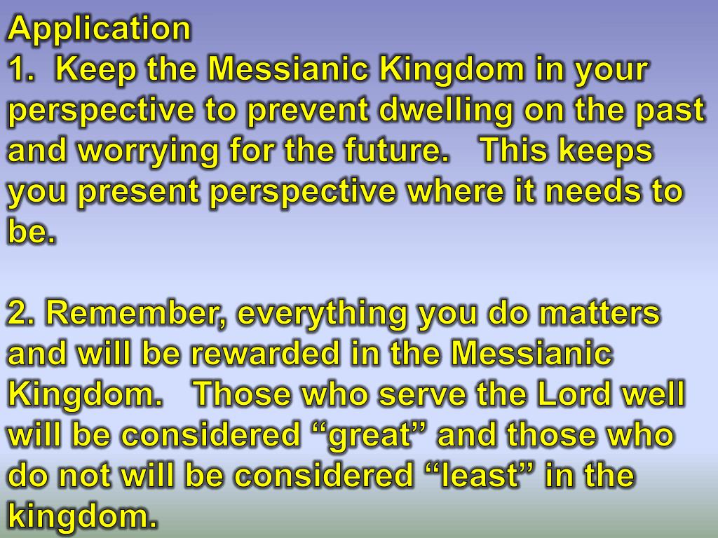 Application 1. Keep the Messianic Kingdom in your perspective to prevent dwelling on the past and worrying for the future. This keeps you present perspective where it needs to be. 2. Remember, everything you do matters and will be rewarded in the Messianic Kingdom. Those who serve the Lord well will be considered “great” and those who do not will be considered “least” in the kingdom.