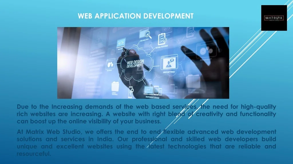Web Application Development Due to the Increasing demands of the web based services, the need for high-quality rich websites are increasing. A website with right blend of creativity and functionality can boost up the online visibility of your business. At Matrix Web Studio, we offers the end to end flexible advanced web development solutions and services in India. Our professional and skilled web developers build unique and excellent websites using the latest technologies that are reliable and resourceful.
