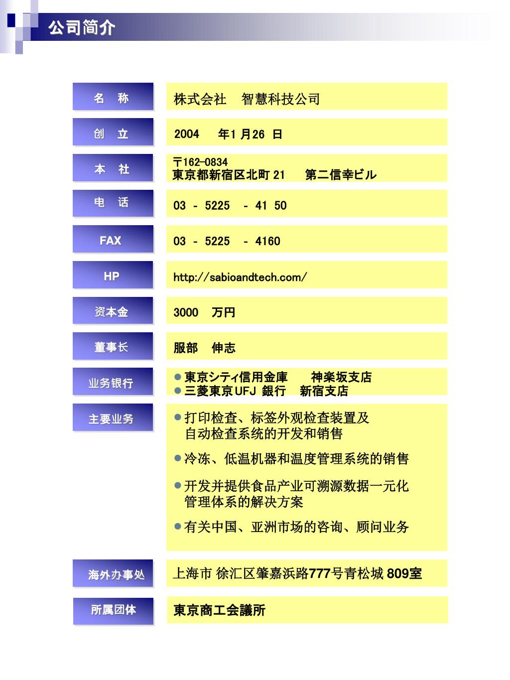 公司简介 名称 株式会社 智慧科技公司 株式会社 サビオアンドテック 名 称 名称 名称 名称 2004 創立 平成 16 年 年 1 1 月 月 26 26 日 日 创 立 創立 創立 創立 〒 162 - 0834 〒 162 - 0834 本社 本 社 本社 本社 本社 東京都新宿区北町 21 第二信幸ビル 東京都新宿区北町 21 第二信幸ビル 电 话 電話 03 03 ‐ ‐ 5225 5225 ‐ ‐ 41 41 50 50 電話 電話 電話 FAX 03 03 ‐ ‐ 5225 5225 ‐ ‐ 4160 4160 FAX FAX FAX FAX HP http://sabioandtech.com/ http://sabioandtech.com/ HP HP HP HP 資本金 3000 3000 万円 万円 資本金 资本金 資本金 資本金 资本金 代表取締役 董事长 服部 服部 伸志 伸志 代表取締役 代表取締役 代表取締役 東京シティ信用金庫 東京シティ信用金庫 神楽坂支店 神楽坂支店 l l 取引銀行 业务银行 取引銀行 取引銀行 取引銀行 三菱東京 三菱東京 UFJ UFJ 銀行 銀行 新宿支店 新宿支店 l l 打印检查、标签外观检查装置及 自动检查系统的开发和销售 印字・ラベル・外観検査装置及び自動化 l l 主な業務 主な業務 主要业务 主な業務 主な業務 検査システムの開発・販売 冷冻、低温机器和温度管理系统的销售 冷凍・低温機器、温度管理システムの販売 l l 食品産業向け、トレサビリティ・データ一元 开发并提供食品产业可溯源数据一元化 管理体系的解决方案 l l 管理システムの提案開発 有关中国、亚洲市场的咨询、顾问业务 中国・アジアビジネスに係わるマーケテング l l ・コンサル業務 上海市 徐匯区肇嘉浜路777号青松城 809室 上海市 徐汇区肇嘉浜路777号青松城809室 海外拠点 海外拠点 海外办事处 海外拠点 海外拠点 東京商工会議所 所属团体