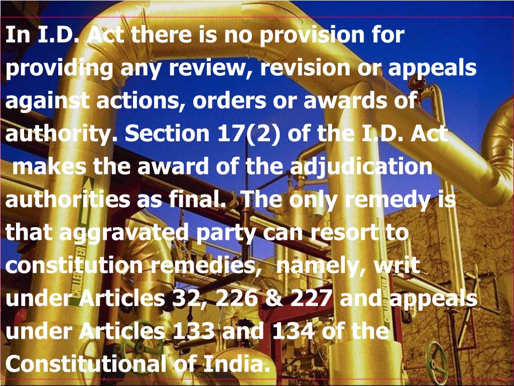 In I.D. Act there is no provision for providing any review, revision or appeals against actions, orders or awards of authority. Section 17(2) of the I.D. Act makes the award of the adjudication authorities as final. The only remedy is that aggravated party can resort to constitution remedies, namely, writ under Articles 32, 226 & 227 and appeals under Articles 133 and 134 of the Constitutional of India.