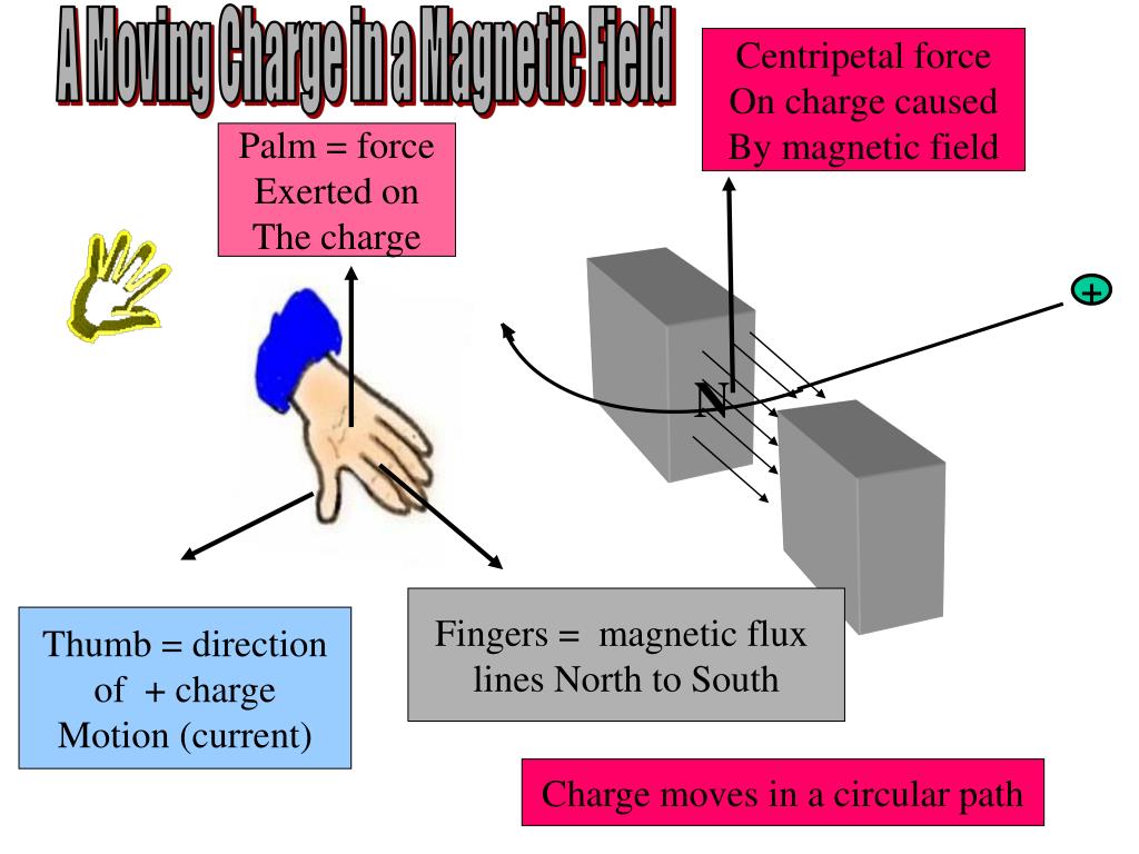 A Moving Charge in a Magnetic Field Centripetal force On charge caused By magnetic field Palm = force Exerted on The charge + N Fingers = magnetic flux lines North to South Thumb = direction of + charge Motion (current) Charge moves in a circular path