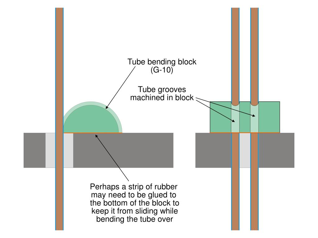 Tube bending block (G-10) Tube grooves machined in block Perhaps a strip of rubber may need to be glued to the bottom of the block to keep it from sliding while bending the tube over