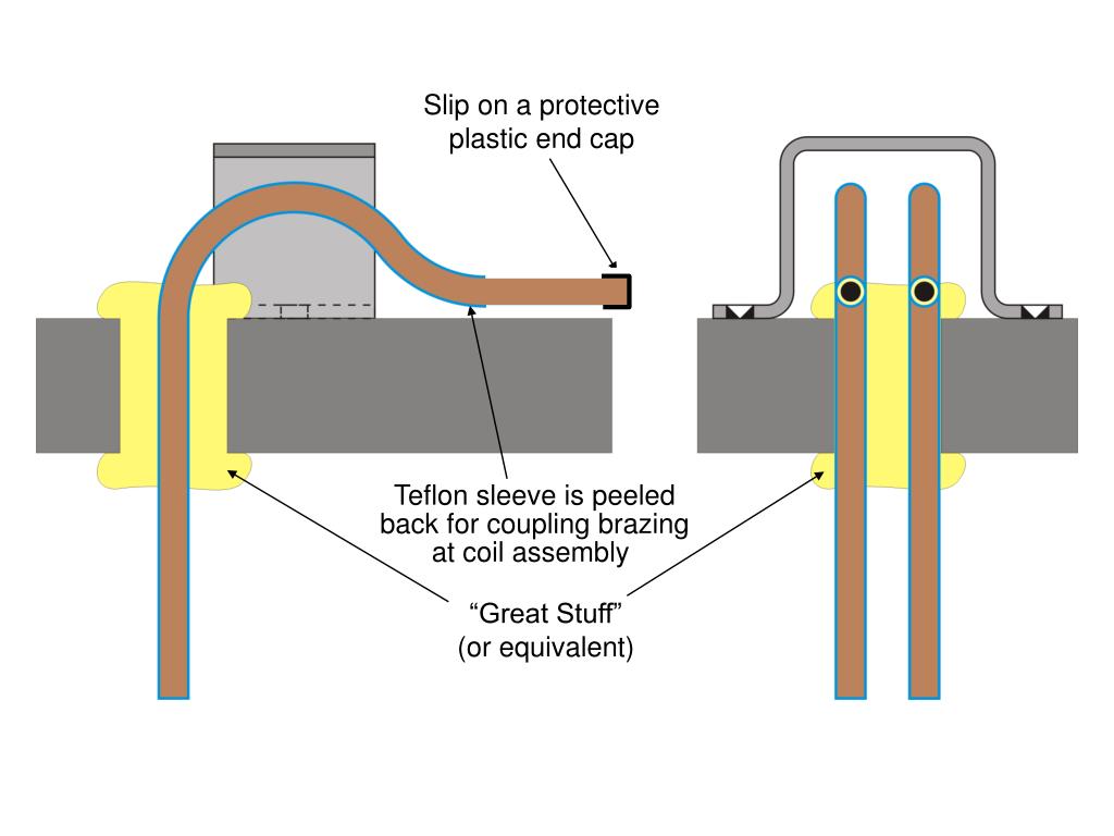 Slip on a protective plastic end cap Teflon sleeve is peeled back for coupling brazing at coil assembly “Great Stuff” (or equivalent)