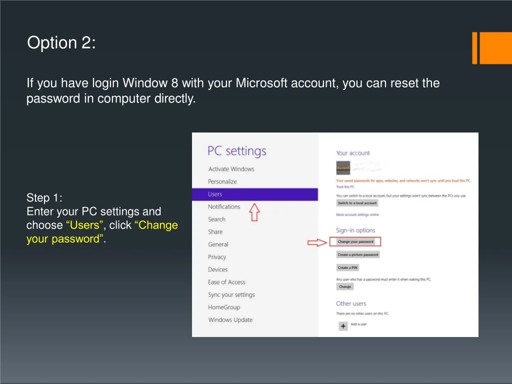 If you have login Window 8 with your Microsoft account, you can reset the password in computerdirectly. Option2: Step1: Enter your PC settings and choose “Users”, click “Change yourpassword”.