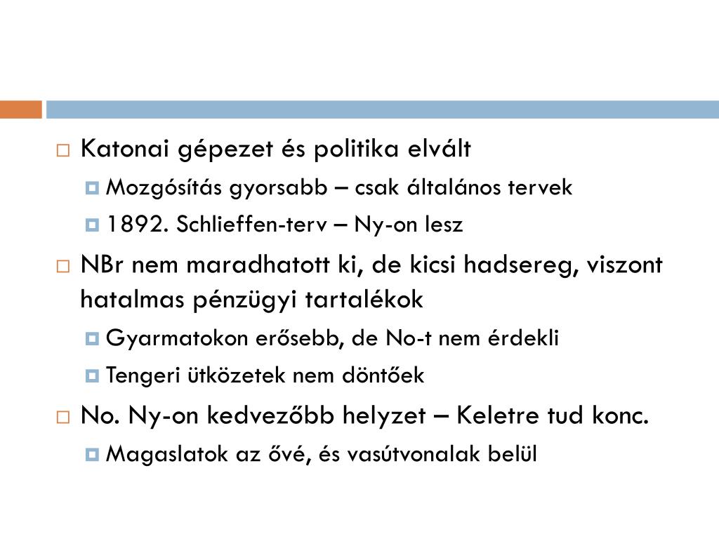 Katonai gépezet és politika elvált • Mozgósítás gyorsabb – csak általános tervek • 1892. Schlieffen-terv – Ny-on lesz • NBr nem maradhatott ki, de kicsi hadsereg, viszont hatalmas pénzügyi tartalékok • Gyarmatokon erősebb, de No-t nem érdekli • Tengeri ütközetek nem döntőek • No. Ny-on kedvezőbb helyzet – Keletre tud konc. • Magaslatok az ővé, és vasútvonalak belül