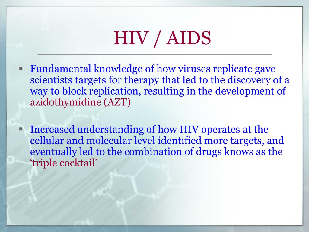 HIV / AIDS • Fundamental knowledge of how viruses replicate gave scientists targets for therapy that led to the discovery of a way to block replication, resulting in the development of azidothymidine (AZT) • Increased understanding of how HIV operates at the cellular and molecular level identified more targets, and eventually led to the combination of drugs knows as the ‘triple cocktail’