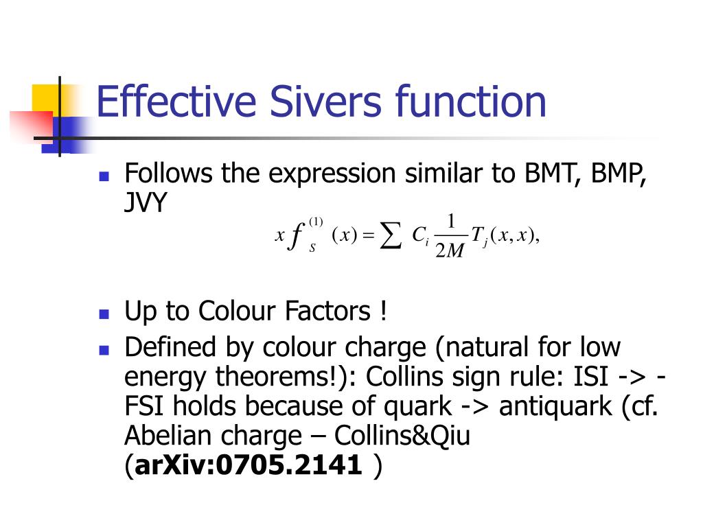 Effective Sivers function • Follows the expression similar to BMT, BMP, JVY • Up to Colour Factors ! • Defined by colour charge (natural for low energy theorems!): Collins sign rule: ISI -> - FSI holds because of quark -> antiquark (cf. Abelian charge – Collins&Qiu (arXiv:0705.2141)