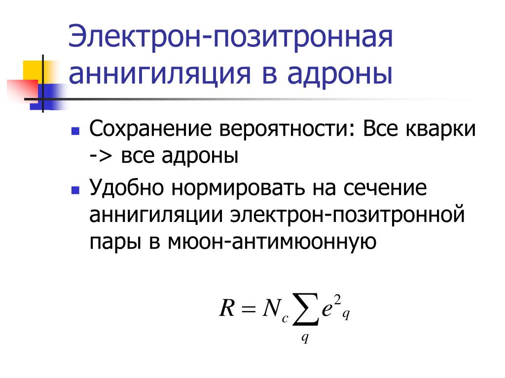 Электрон-позитронная аннигиляция в адроны • Сохранение вероятности: Все кварки -> все адроны • Удобно нормировать на сечение аннигиляции электрон-позитронной пары в мюон-антимюонную