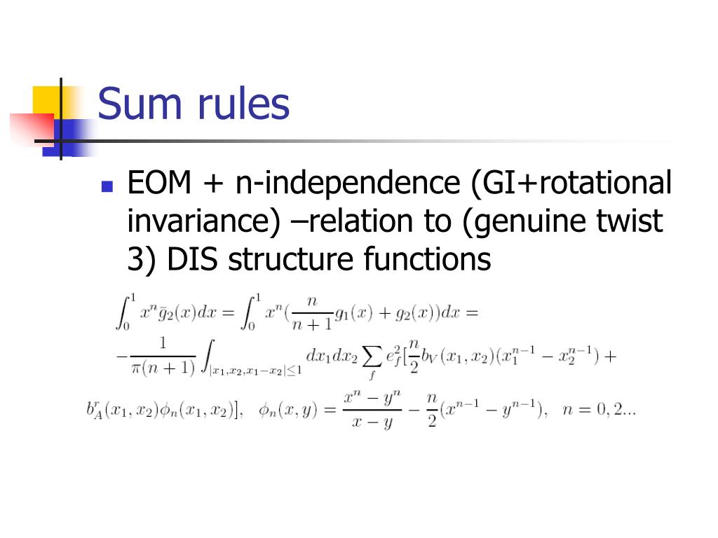Sum rules • EOM + n-independence (GI+rotational invariance) –relation to (genuine twist 3) DIS structure functions