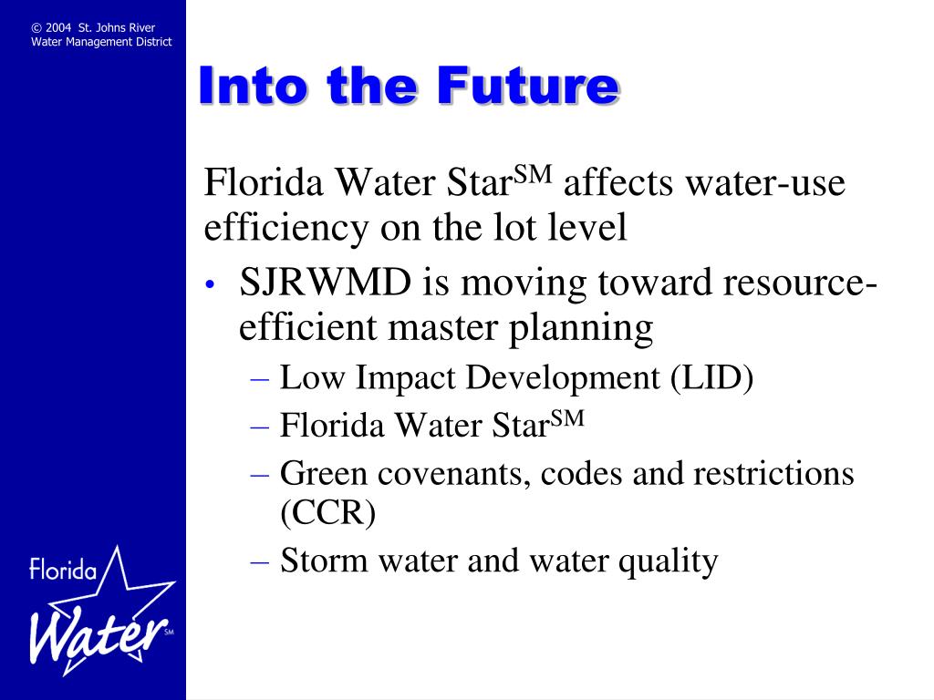 Into the Future Florida Water StarSM affects water-use efficiency on the lot level • SJRWMD is moving toward resource-efficient master planning • Low Impact Development (LID) • Florida Water StarSM • Green covenants, codes and restrictions (CCR) • Storm water and water quality
