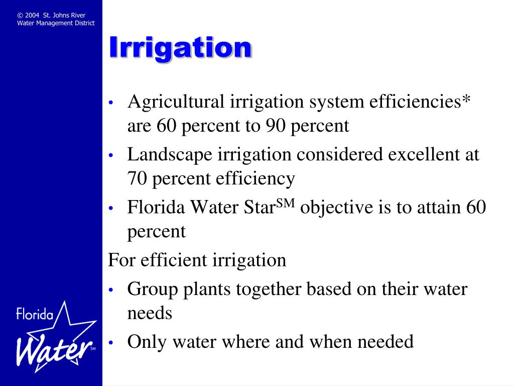 Irrigation • Agricultural irrigation system efficiencies* are 60 percent to 90 percent • Landscape irrigation considered excellent at 70 percent efficiency • Florida Water StarSM objective is to attain 60 percent For efficient irrigation • Group plants together based on their water needs • Only water where and when needed