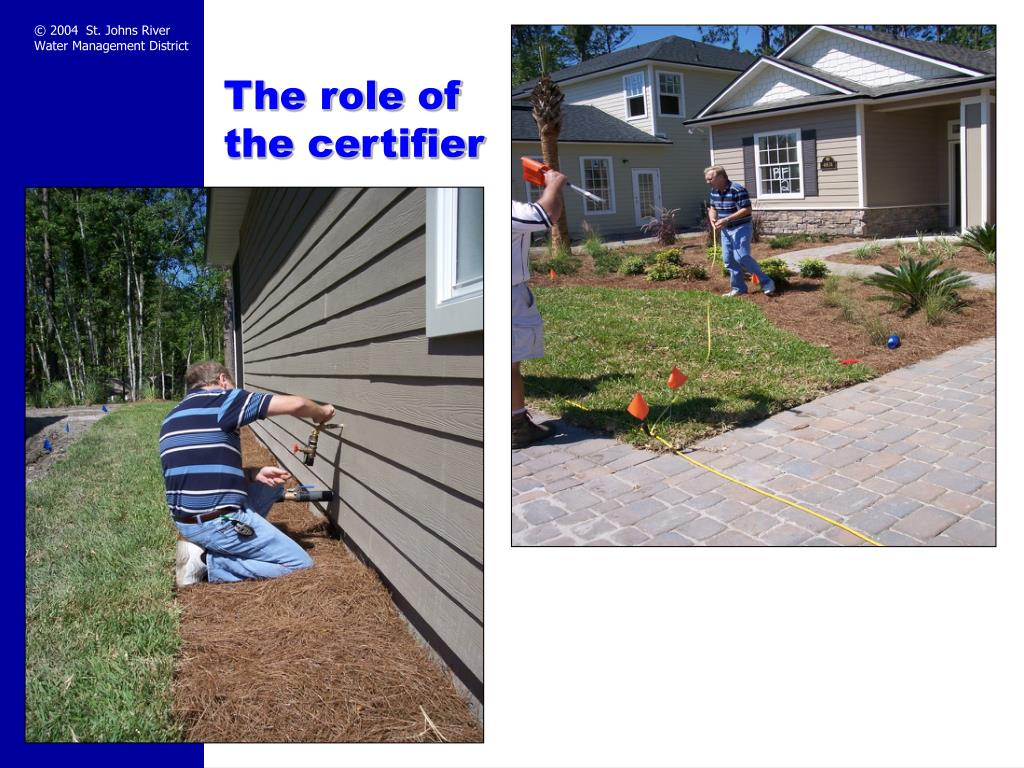 Florida WaterStarSM 2007 • Indoor • Florida Water StarSM standards • Accredited individuals/companies for inspection • Check list • Irrigation • Florida Water StarSM standards • Accredited individuals/companies for inspection • Check list • Landscaping • Florida Water StarSM standards • Accredited individuals/companies for inspection • Check list • Certifier/Providers • Assess • Paperwork • Designs • Qualifications • Issue certification • Florida Water StarSM Agency • Develop criteria for certifiers • Administer test of certifiers • Inspect certifiers • Random annual inspection of landscapers, plumbers and • irrigation firms • Maintain records