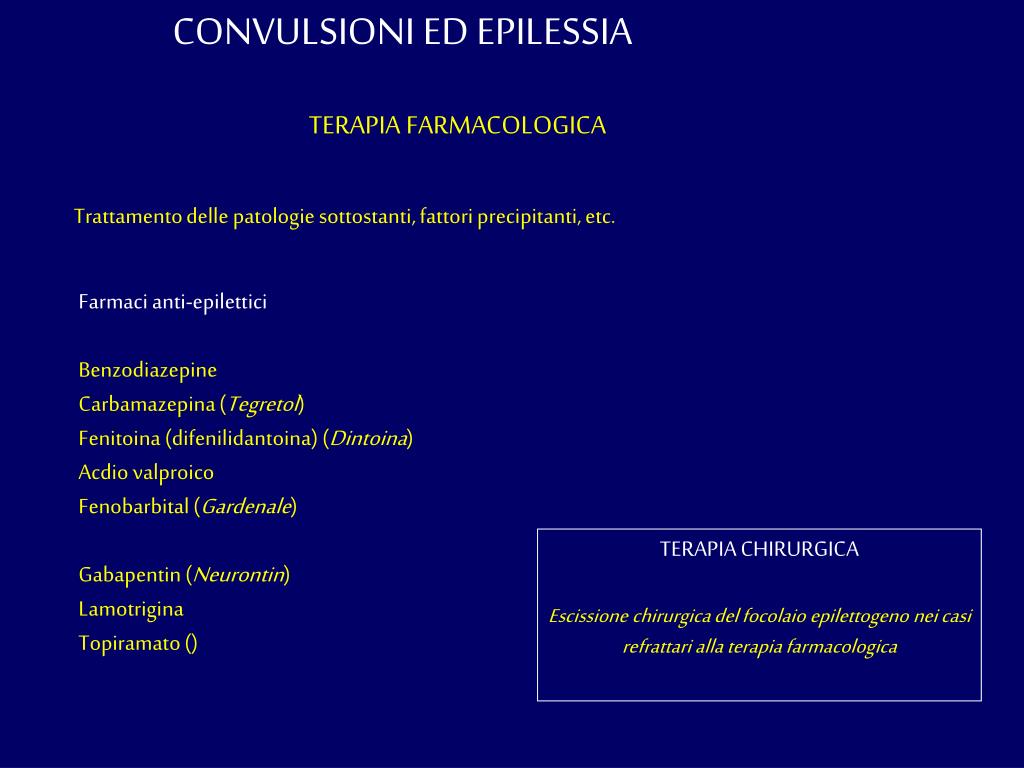 CONVULSIONI ED EPILESSIA TERAPIA FARMACOLOGICA Trattamento delle patologie sottostanti, fattori precipitanti, etc. Farmaci anti-epilettici Benzodiazepine Carbamazepina (Tegretol) Fenitoina (difenilidantoina) (Dintoina) Acdio valproico Fenobarbital (Gardenale) Gabapentin (Neurontin) Lamotrigina Topiramato () TERAPIA CHIRURGICA Escissione chirurgica del focolaio epilettogeno nei casi refrattari alla terapia farmacologica