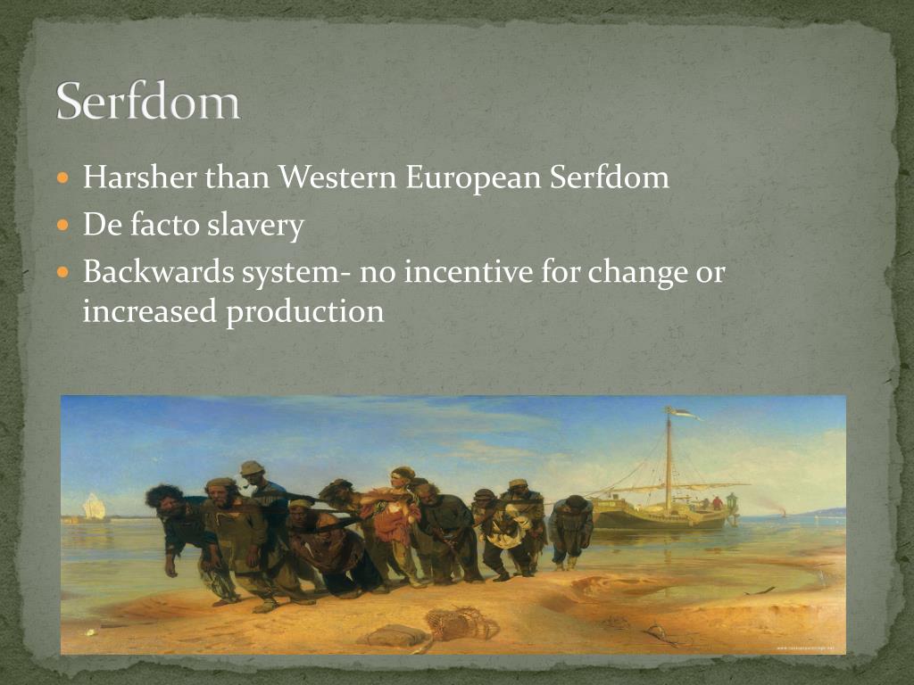 Serfdom • Harsher than Western European Serfdom • De facto slavery • Backwards system- no incentive for change or increased production