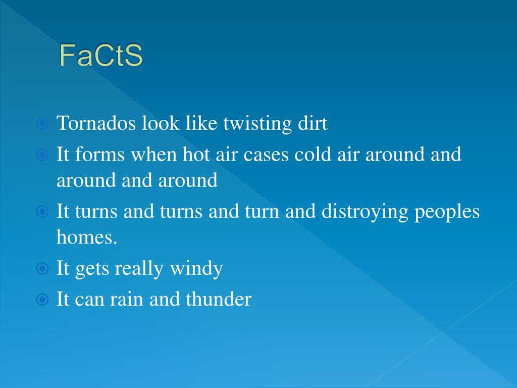 FaCtS • Tornados look like twisting dirt • It forms when hot air cases cold air around and around and around • It turns and turns and turn and distroying peoples homes. • It gets really windy • It can rain and thunder